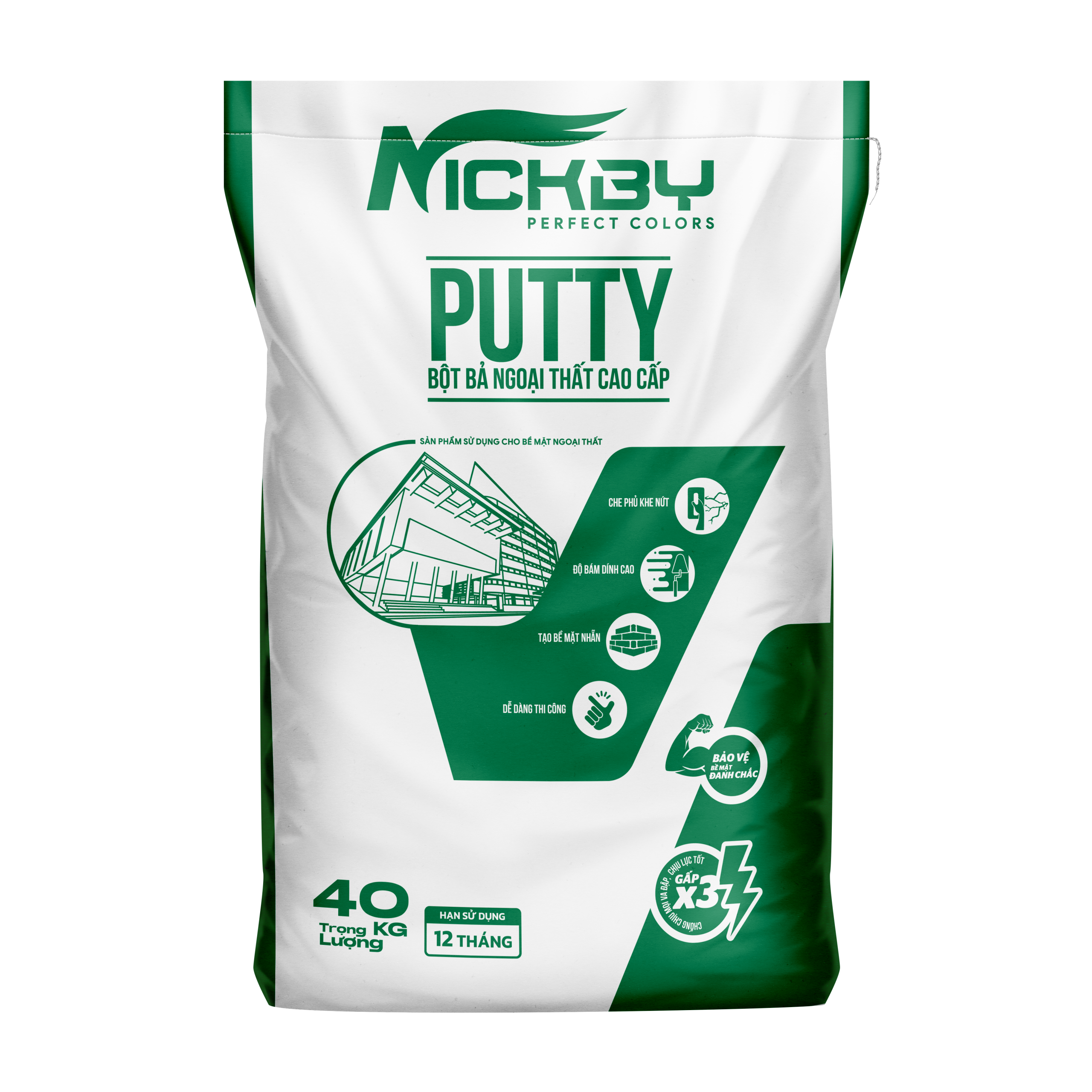 Bột bả ngoại thất cao cấp Nickby là sản phẩm chuyên dụng để xử lý bề mặt tường ngoài trời, tạo lớp nền phẳng mịn và bền chắc, chuẩn bị cho thi công sơn phủ. Sản phẩm giúp tăng độ bám dính, chống nứt, chống thấm, dễ thi công và bảo vệ bề mặt tường trước các tác nhân thời tiết khắc nghiệt, mang lại hiệu quả lâu dài cho công trình.